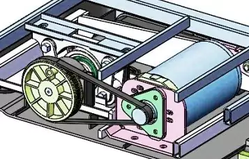 In a pivotal oscillation plate, the motor drives the crank-bar (red) via a belt. The crank-bar, designed with a circular shape, allows smooth rotation by the belt. This rotation is transmitted to the coupler-bar (green) and the rocker-bar (blue). The exercise platform is mounted on the rocker-bar. As the crank-bar rotates, the coupler-bar moves the rocker-bar, causing the exercise platform to oscillate in a seesaw motion.
